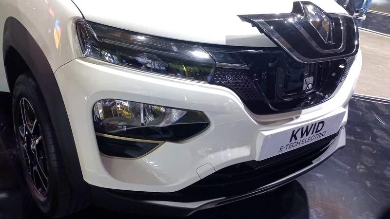 La propuesta E-Tech del Kwid guarda mucha similitud estética y de proporciones con respecto a su hermano de gasolina, siendo el principal diferenciador la parrilla, que en caso del BEV se distingue por el fondo plano negro, que se decora con dos franjar plateadas que la integran vidualmente con la línea de la luz de circulación diurna.