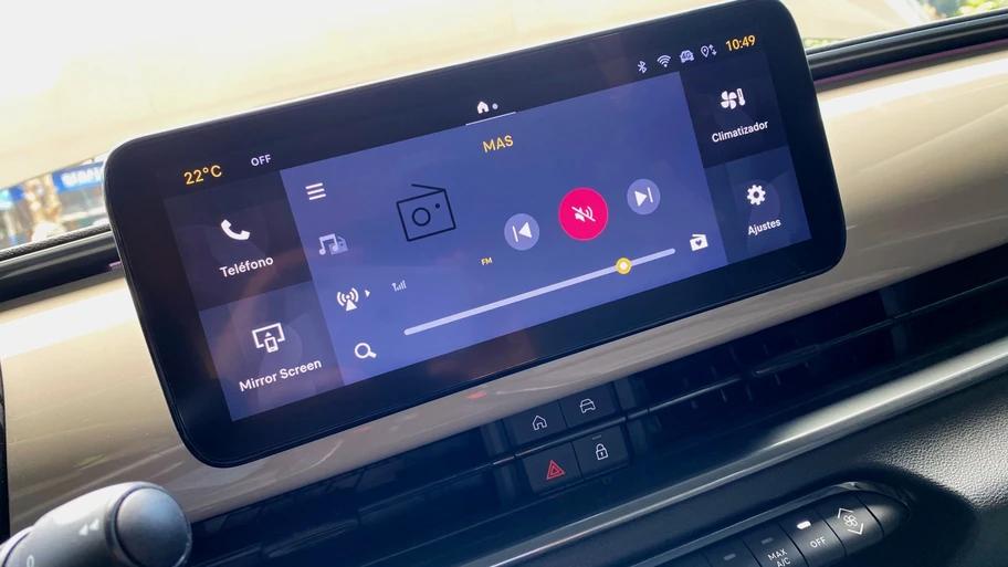 La interfaz del vehículo se centra en dos pantallas: un panel de instrumentos digital de 7 pulgadas totalmente configurable y un centro multimedia de 10 pulgadas con conectividad inalámbrica para Android Auto y Apple CarPlay. El volante multifunción, ajustable en altura y profundidad, integra levas de cambio y está forrado en cuero ecológico.