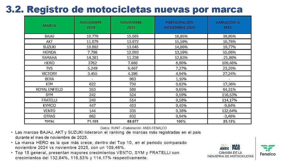 En cuanto a marcas, Bajaj, AKT y Suzuki lideraron el mes, con participaciones de 16,95%, 15,59% y 14,66%, respectivamente. Honda fue la marca tradicional con mayor crecimiento mensual (55,08%), mientras que Hero registró el salto más notable dentro del Top 10, duplicando sus ventas frente a noviembre del año anterior (de 3.762 a 7.880 matrículas nuevas).