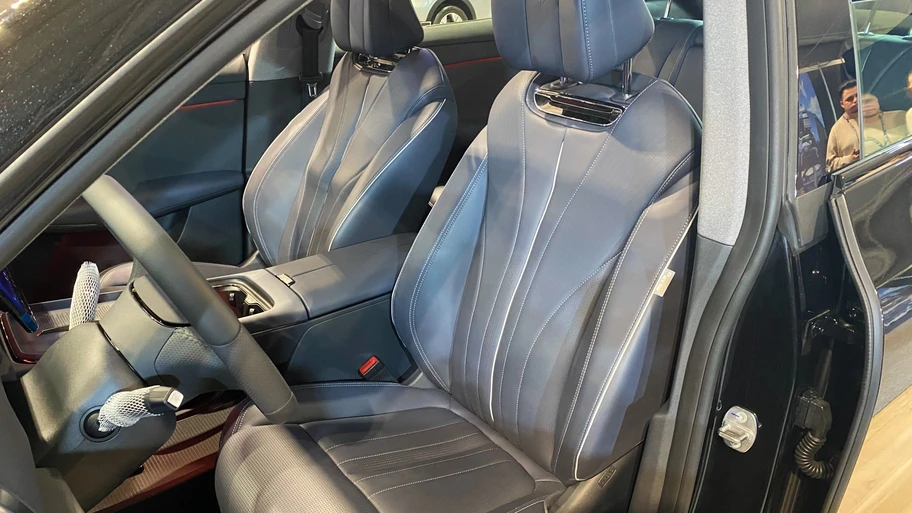 Otros elementos destacados incluyen iluminación ambiental de 128 colores, tapizados en cuero microperforado con costuras blancas de contraste, climatización de doble zona con bomba de calor, sistema de filtración de aire de alta eficiencia, apoyabrazos refrigerado, función automática de desempañador de vidrios, monitoreo modo mascota, cámara 360° y carga inalámbrica de 50 W.