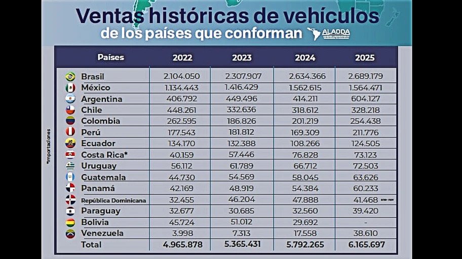 Más de 6,1 millones de vehículos nuevos se comercializaron durante 2025 en los principales mercados de Latinoamérica y el Caribe, según el más reciente reporte de la Asociación Latinoamericana de Distribuidores de Automotores (Aladda). El resultado supone un crecimiento del 7,1% frente al 2024 y confirma un mejor momento económico para la región, con un impacto directo en la dinámica del sector automotor.