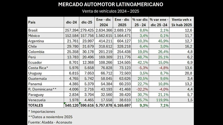 A nivel regional, diciembre de 2025 cerró con un incremento interanual del 9,3% en las ventas de vehículos. Venezuela y Perú lideraron el crecimiento mensual, mientras que Costa Rica fue el único país que registró una contracción en ese periodo.