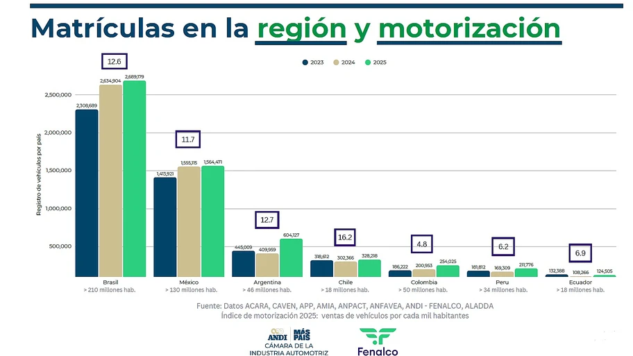 Si bien las cifras de la industria automotriz en Colombia muestran un aumento paulatino en los últimos tres años y que en 2025 el país ocupó el quinto lugar en ventas en Latinoamérica, aún mantiene uno de los índices de motorización más bajos de la región: 4,8 vehículos por cada mil habitantes, lo que evidencia una gran oportunidad de crecimiento.