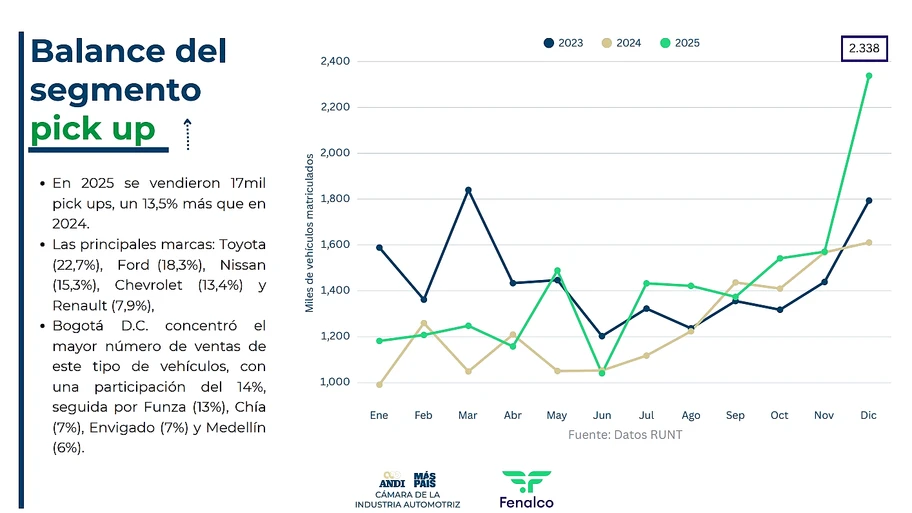 De acuerdo con cifras oficiales del RUNT, recopiladas por Fenalco-Andi, durante el año pasado se matricularon 17.006 pick-ups nuevas en el país, lo que representa un crecimiento del 13,5 % frente a 2024, en un contexto de recuperación general del sector y mayor dinamismo en la demanda de vehículos utilitarios y recreativos.