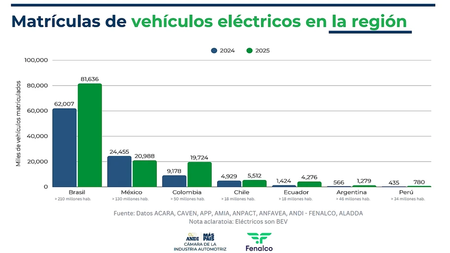 Con esta buena dinámica, Colombia se consolidó como el tercer mercado de vehículos eléctricos en Latinoamérica, solo por detrás de Brasil y México. Mientras que Brasil pasó de 62.007 unidades en 2024 a 81.636 en 2025, y México cerró el año con 20.988 registros, Colombia prácticamente duplicó su volumen, superando con amplitud a países como Chile, Ecuador, Argentina y Perú.