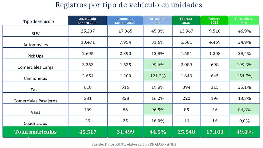 El sector automotor colombiano mantuvo en febrero de 2026 la tendencia de recuperación que se evidenció desde el año pasado. De acuerdo con el informe del sector preparado por Fenalco y la ANDI, con base en cifras del RUNT, durante el segundo mes del año se matricularon 25.548 vehículos nuevos, lo que representa un crecimiento del 49,4 % frente a las 17.103 unidades registradas en febrero de 2025.