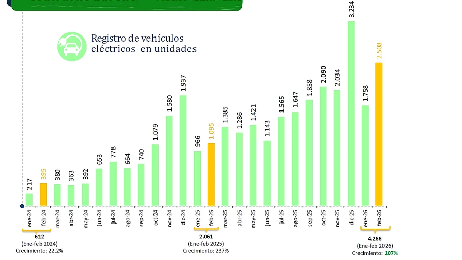 Uno de los datos más relevantes del informe de febrero corresponde al desempeño de las tecnologías de bajas emisiones. En el segundo mes del año se matricularon 2.508 vehículos eléctricos, un 129 % más que en el mismo mes de 2025, convirtiéndose en el segundo mejor registro mensual histórico para este tipo de propulsión. En el acumulado enero-febrero, los eléctricos alcanzan 4.266 unidades, con un crecimiento del 107 %.