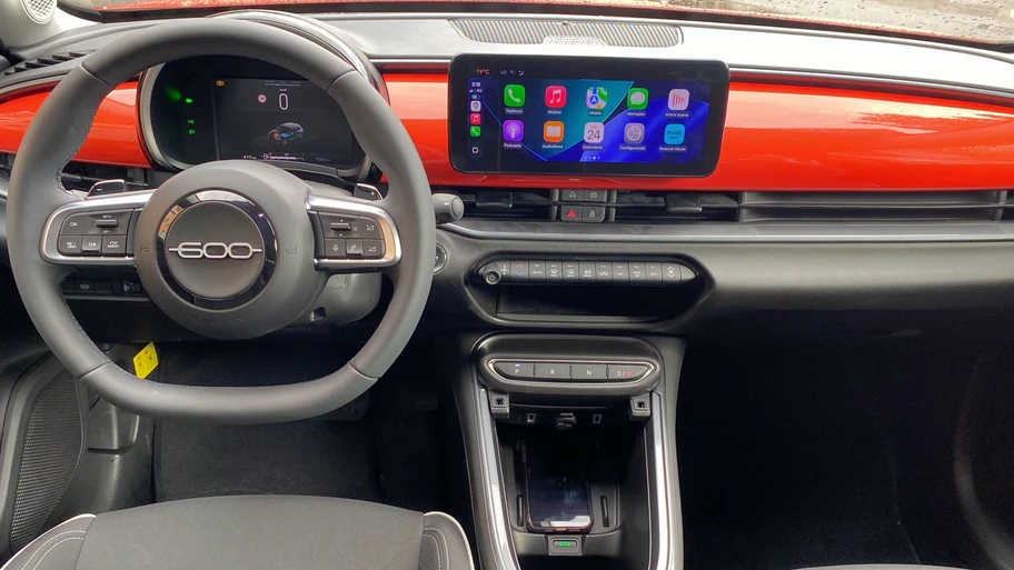 Puertas adentro, el Fiat 600 Híbrido mantiene el guiño retro con un tablero horizontal y una presentación limpia. La instrumentación digital (7”) y la pantalla central táctil de 10” (la del Stonic Vibrant es de 12,3”) lo alinean con el estándar del segmento, con conectividad inalámbrica para Android Auto y Apple CarPlay. Además, incluye sistema de audio con seis parlantes, climatización automática y cargador inalámbrico para celular.