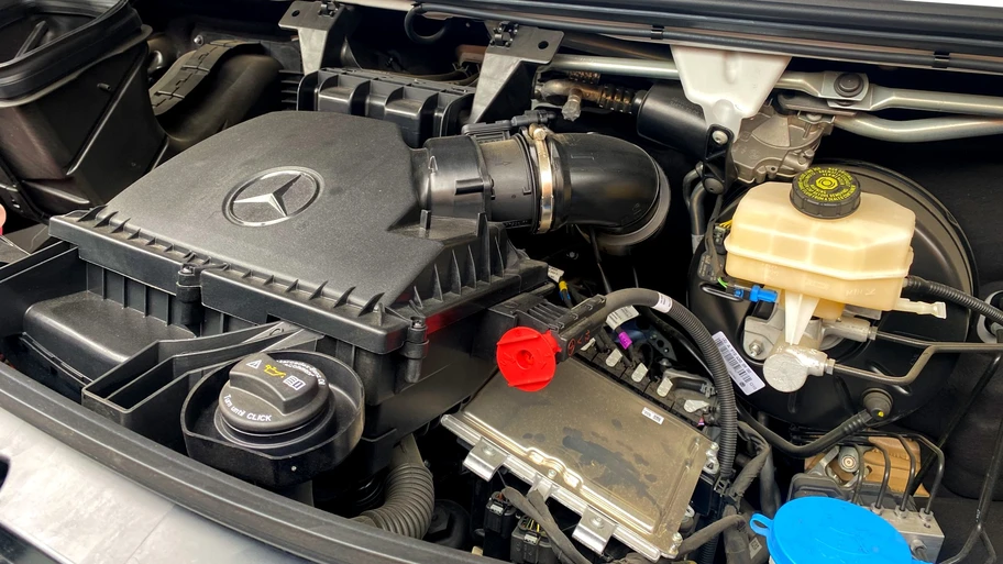 En el apartado mecánico, la nueva van de Mercedes-Benz equipa el motor turbodiésel de geometría variable OM654 de 2,0 litros, que entrega 113 hp y 300 Nm de torque. Este propulsor está acoplado a una transmisión manual Mercedes-Benz ECO Gear de seis velocidades y sistema de tracción trasera, característica poco común en su segmento.